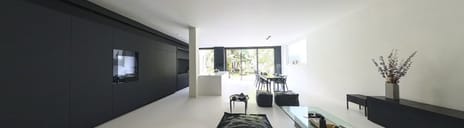 The main residence is situated at the rear. An open floor plan, 2.90 metres high ceilings, and full-width glass walls create a sense of space, light, and clarity. The seamless cast PU floor with underfloor heating runs throughout the property.