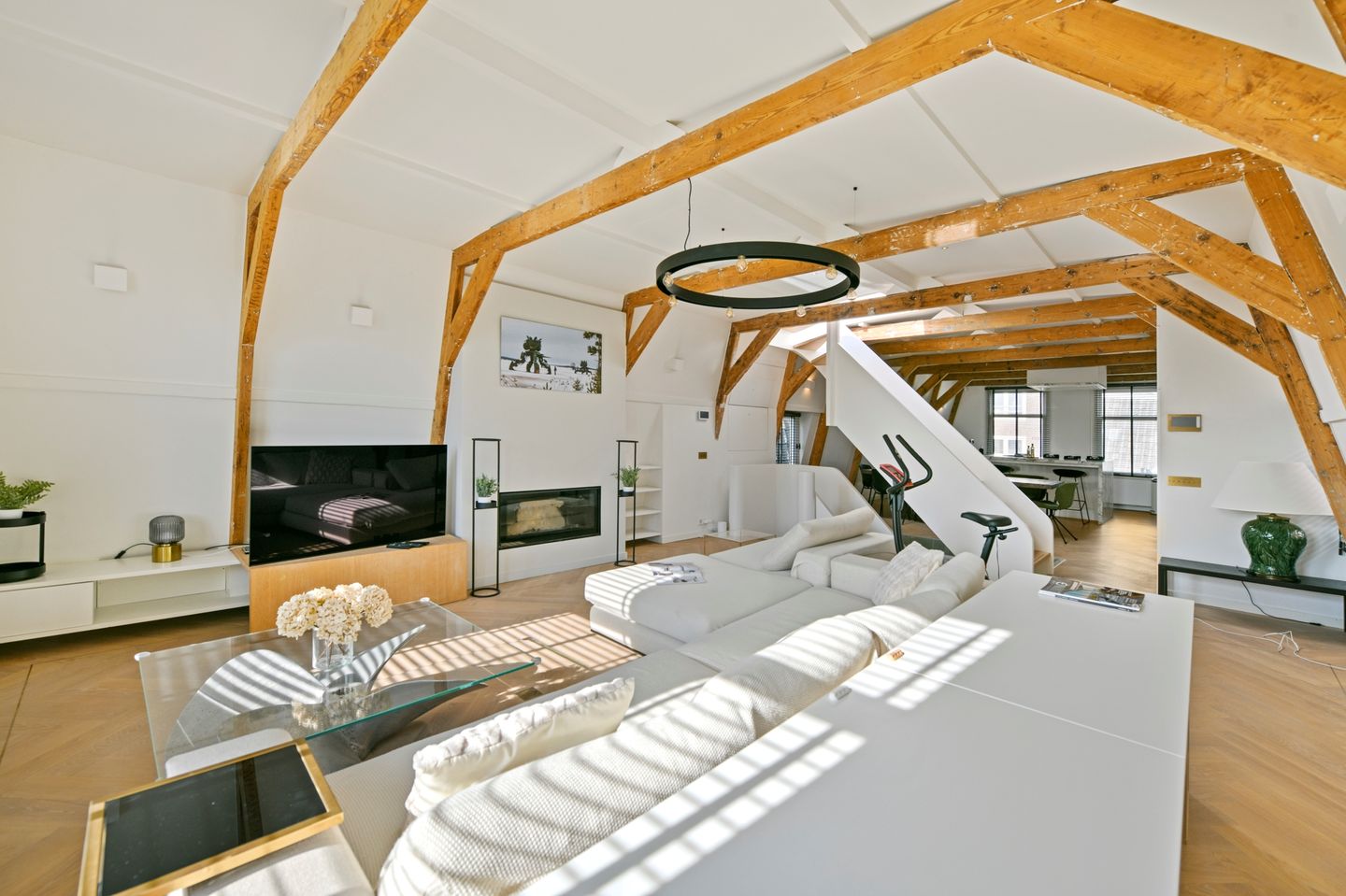 windows, high ceilings with original wooden beams, the inviting fireplace, and the beautiful wooden herringbone floor. Here too, custom-made built-in cabinets provide ample storage space. The open-plan kitchen/diner (approx. 35 m²) forms the heart of this floor. This luxurious designer kitchen features marble countertops, a spacious cooking island, and high-quality Miele appliances, including a steam oven, wine cooler, American-style refrigerator, microwave, oven, dishwasher, and ceiling extractor hood. A perfect space for those who enjoy cooking, entertaining, or dining in style. A staircase leads to the delightful roof terrace (22 m²), where you can