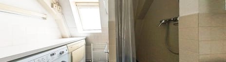 The semi-open kitchen (renovated in 2014–2015) is centrally located. At the front, there is a bedroom with an adjoining workspace. The bathroom, located in the middle, features a shower, sink, and washing machine connection. There is also a separate toilet.