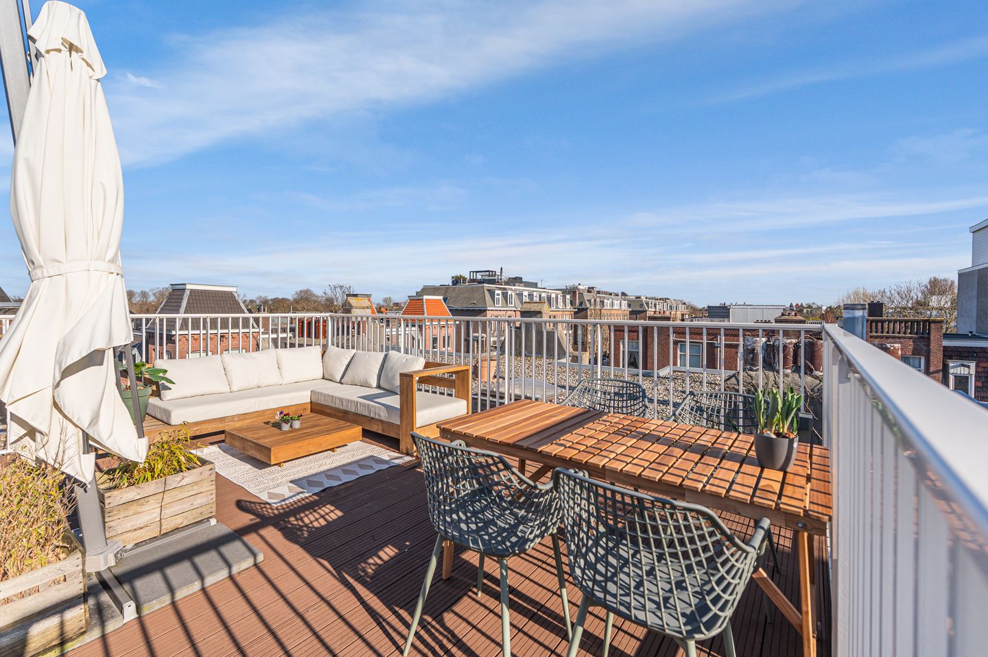 A fixed staircase leads to the absolute highlight of this home: the impressive roof terrace. It's truly a comfortable place to relax. Whether you want to sunbathe, enjoy drinks with friends, or simply relax on long summer evenings, this rooftop terrace offers all the space and privacy you need to fully enjoy the outdoors. From here, you have a beautiful panoramic view of Amsterdam-Zuid. Lighting and a water connection have been carefully considered.