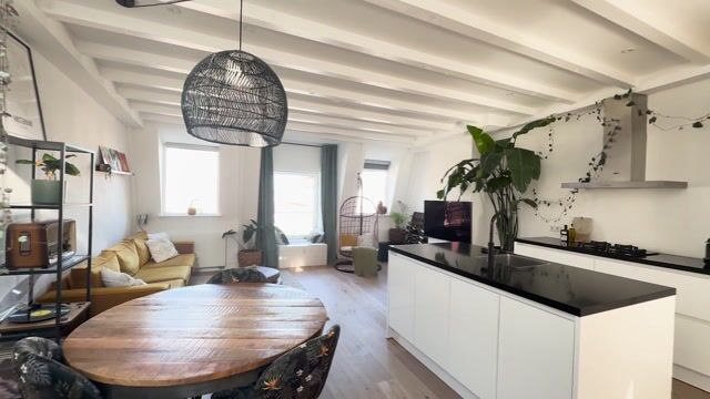 Upon entering, you'll immediately notice the beautiful natural light and the lovely high ceiling with characteristic beams. The spacious living room forms the heart of the home and features a modern open-plan kitchen with a sink island (and Quooker). A wonderful place to cook and entertain. The open layout creates a spacious feeling and a pleasant living space.