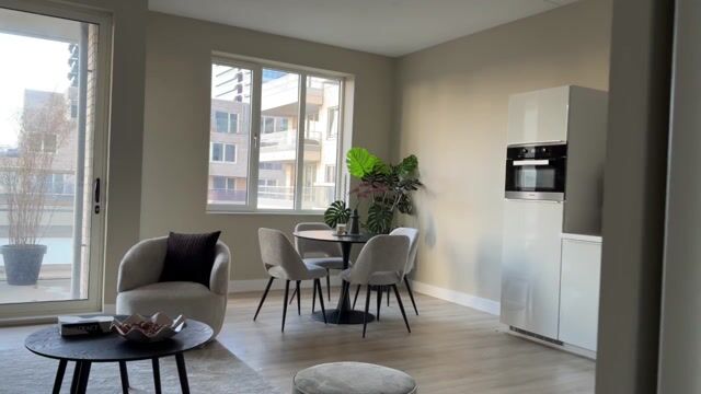 Through the elegant entrance with video intercom and elevator, you reach the 7th floor. The hallway provides access to all rooms. The spacious living room is a bright and open space with large windows and stunning views of the modern architecture of the Zuidas. The open kitchen is equipped with high-quality Miele built-in appliances, including an induction cooktop, combi oven, dishwasher, and fridge-freezer. The light PVC flooring with underfloor heating adds extra comfort. From the living room, you step onto the sunny balcony—perfect for relaxing in the afternoon and evening sun.
