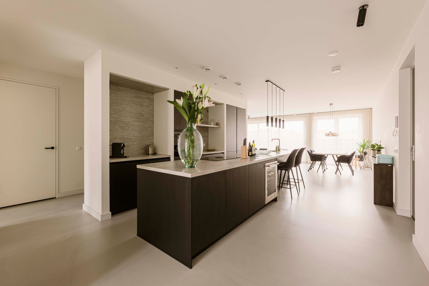 The apartment meets the most recent building requirements, is gas-free, and beautifully finished with high-quality materials combined with custom features. Upon entering, the open-plan kitchen is a true eye-catcher, fully equipped with all necessary appliances and elegantly designed with a coffee corner, an island bar, and a wine cooler. As the kitchen is centrally placed, it serves as the true heart of the home. The living room with dining area is pleasantly situated at the rear and provides access to the spacious adjoining balcony facing southeast. Both well-sized bedrooms feature French balconies, while the neat bathroom completes the picture.
