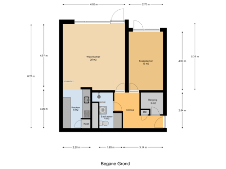 Via de centrale entree met brievenbussen en bellenplateau bereikt u de woning. De eigen voordeur opent naar de hal die toegang biedt tot alle vertrekken. Direct bij binnenkomst valt de praktische indeling op: een ruime berging met meterkast, een eenvoudige maar functionele badkamer met douche, wastafel en toilet, en de doorgang naar zowel de woonkamer als de slaapkamer.