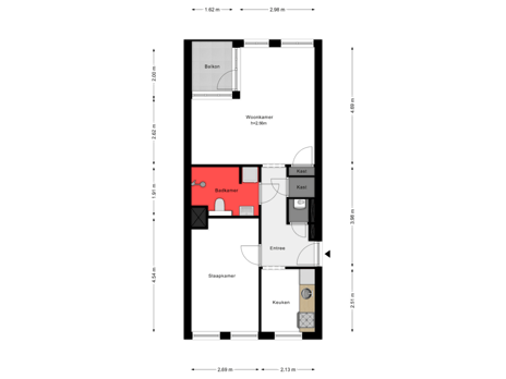 Through the front door, you enter the hall with a storage closet and access to all rooms. The living room features wide windows, allowing plenty of natural light to enter. From the living room, you have access to the west-facing balcony. The modern kitchen is located at the front of the apartment and is equipped with a gas stove, stainless steel extractor hood, and fridge/freezer. The luxurious bathroom is tiled to the ceiling and includes a shower, vanity, wall-hung toilet, washing machine, dryer, and designer radiator. The spacious bedroom is located at the front and features a double bed and a large wardrobe.