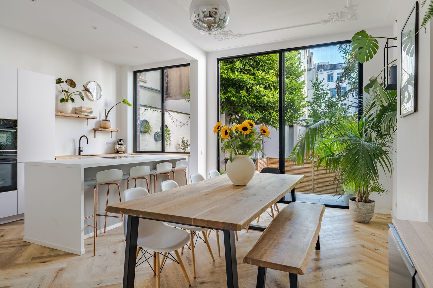 Renovated, this striking 5-bedroom home combines historic charm and period features with modern living. The interior features impressive high ceilings, classic stained-glass sliding doors and large windows that flood the space with natural light. The spacious living room at the front offers stunning views of the greenery and tranquil waters of the Singel Canal. The generous dining area flows seamlessly into a modern, fully equipped kitchen - perfect for entertaining guests. The kitchen features a sleek island, induction cooktop, oven, combination oven, large refrigerator with separate freezer, dishwasher, Quooker faucet and extensive storage.