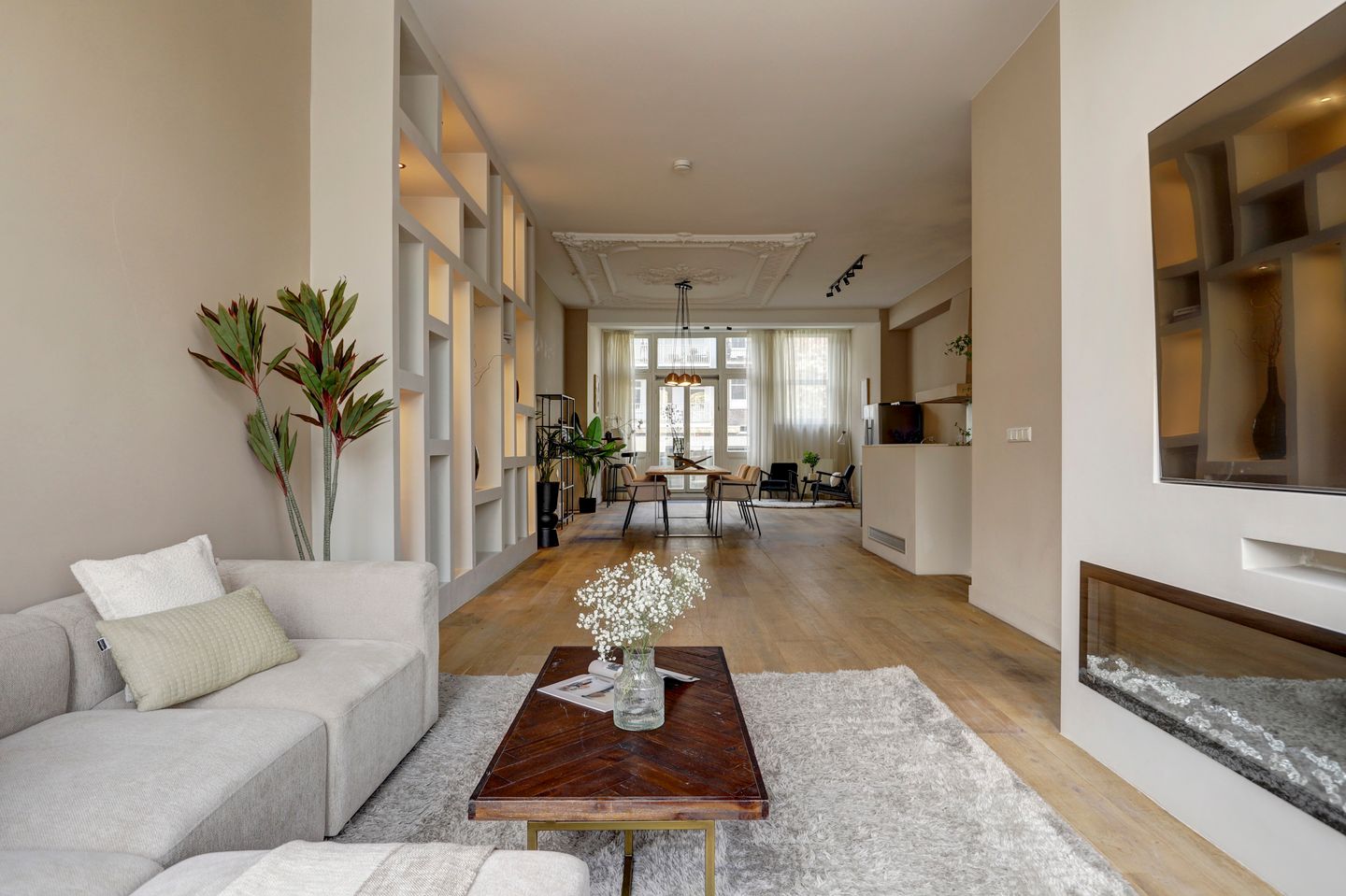 Situated along the beautifully redeveloped Nassaukade, this distinctive and high-quality family home of approximately 181 m² is spread across the ground floor, basement, and a versatile garden house. The property perfectly blends classic charm with modern comfort and was fully renovated in 2014, including the foundation. It is located on freehold land.
