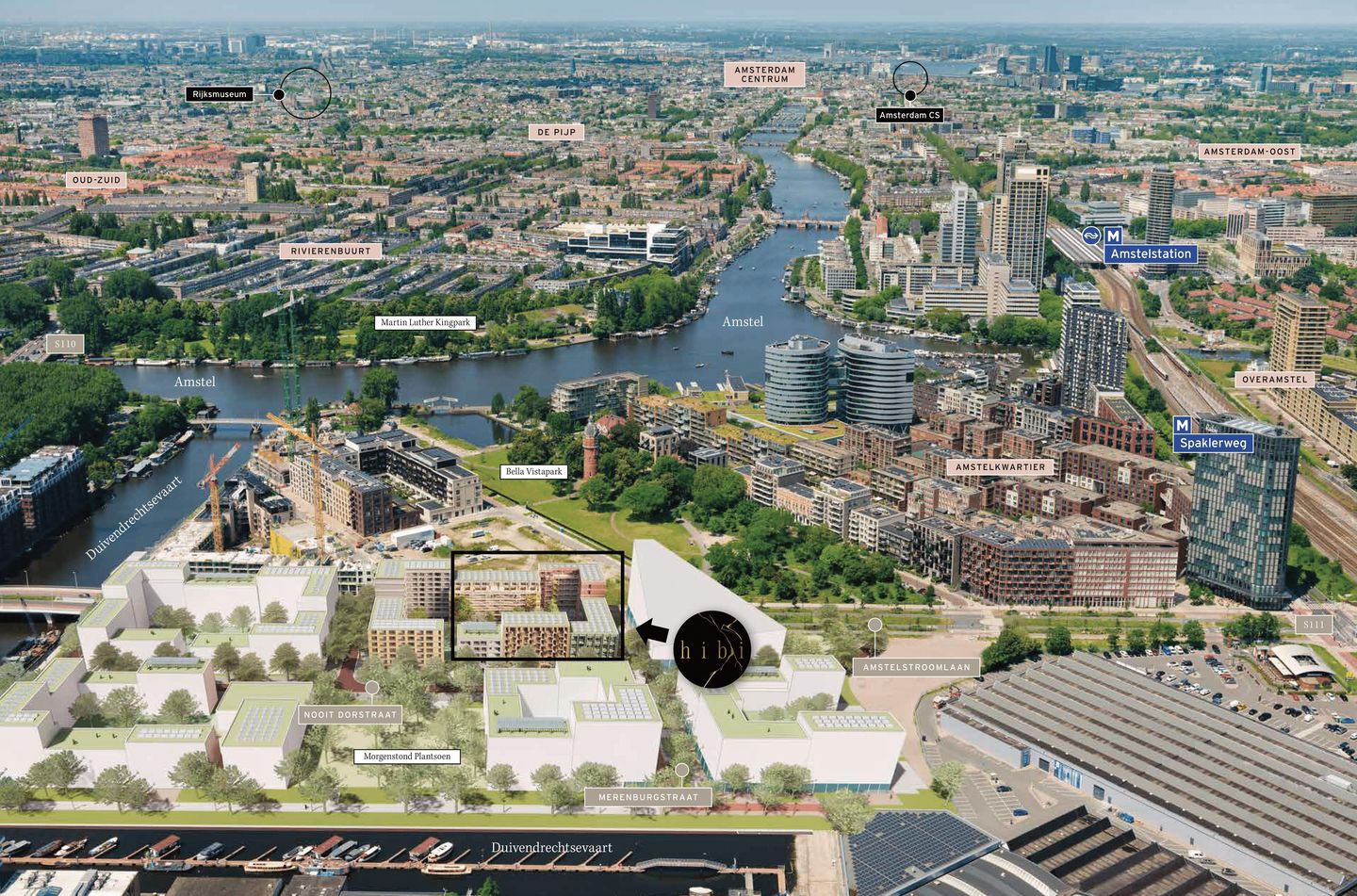 Hibi is located in the beautiful Amstelkwartier. Amstelkwartier is located on the bend of the Amstel in Amsterdam East. The monumental buildings of the former Zuidergasfabriek and the historic water tower in Bella Vistapark give this area its unique atmosphere. But don't forget the cozy Amstelstrand, where you can relax by the water in the summer. The Amstelkwartier is already a dynamic place with a nice mix of housing, fun hotspots, and recreational opportunities, including facilities for sports, education, hospitality, and shopping. There will even be a large supermarket on the ground floor of Hibi, which is super convenient! The existing parks and monuments add to the atmosphere, and don't forget the Amstel, where you can stroll along the water. Whether you enjoy a quiet walk along the Duivendrechtsevaart, admire art in the local galleries, or feast on culinary delights in the trendy restaurants – Overamstel has it all. With the city close by and the tranquility of nature around the corner, Amstelkwartier is the perfect place to live and enjoy life. And if you do want to leave the neighborhood? Fast connections will take you to a terrace in the historic center of Amsterdam, to the central station, or to Schiphol Airport in no time.