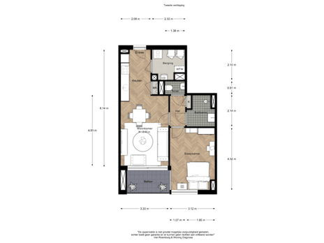 De verkoopinformatie is met grote zorgvuldigheid samengesteld doch voor de juistheid van de inhoud kunnen wij niet instaan en er kunnen derhalve geen rechten aan worden ontleend. De inhoud is puur informatief en mag niet worden beschouwd als een aanbod. Daar waar gesproken wordt over inhoud, oppervlakten of afmetingen moeten deze worden beschouwd als indicatief en als circa maten. Aangezien het nieuwbouw betreft, zijn de opgegeven m2 niet conform de Meetinstructie Gebruiksoppervlakte woningen van de NVM, maar zijn conform opgave architect. U dient als koper zelfonderzoek te verrichten naar zaken die voor u van belang zijn. Wij raden u in dat verband aan uw eigen (NVM-)makelaar in te schakelen.