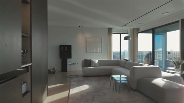 To the right lies the bespoke kitchen, equipped with exclusive appliances from Gaggenau, Siemens, Quooker, and Bora. The kitchen and dining area form the heart of the home and flow openly into the living space. A central integrated coffee bar with a Decent espresso machine and wine climate cabinet has been incorporated. Large windows and long sightlines in the spacious living room ensure abundant natural light and views toward the city. The adjacent southwest-facing balcony extends the living area and is perfect for long evenings outdoors.