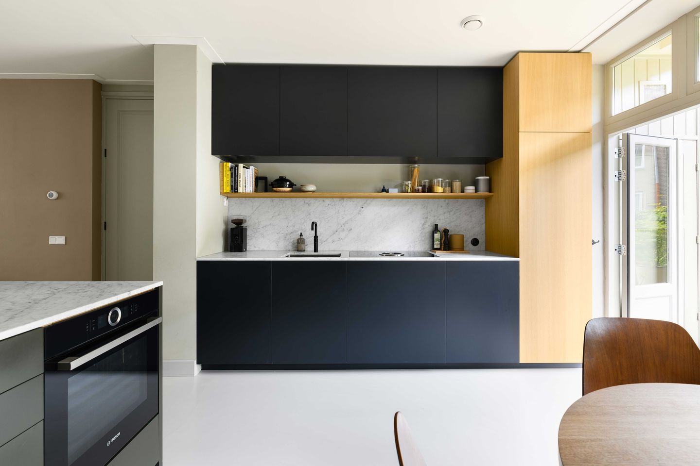 - Voorzien van Bora inductiekookplaat, Quooker, stoomoven, 180cm hoge koelkast, aparte vriezer en vaatwasser (Bosch apparatuur)