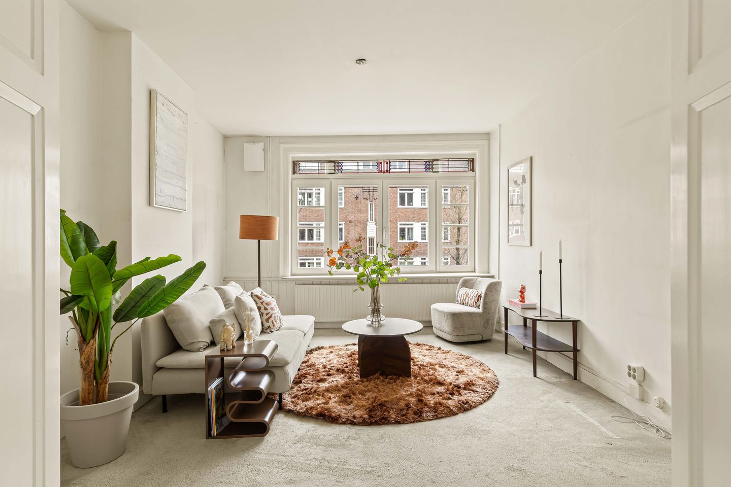 At the front is the spacious living room with large windows and beautiful stained glass in the skylights. Thanks to its wide layout and unobstructed view of the street, this is a particularly light and pleasant living space. The en suite layout with sliding doors connects the living room to the dining room at the rear. This classic layout gives the apartment character and offers the possibility to connect the rooms openly or to use them separately.