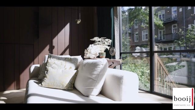 The flat can be entered from the communal entrance and through the private front door which gives access to the souterrain. This stylish Amsterdam flat has luxury and character, including high ceilings, a herringbone parquet floor and a modern marble fireplace as an eye-catcher. At the front is the spacious and bright kitchen diner, equipped with three high windows that let in plenty of natural light. The generous cooking island is equipped with a gas cooker, sink area and high-quality built-in appliances from the Gaggenau brand. In addition, two integrated Liebherr climate control cabinets are incorporated in the island.