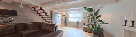 The apartment was completely renovated under architecture in 2023 by renowned architect Winkelaar. Every detail has been carefully designed, preserving the monumental character while adding modern comfort. Features include herringbone oak floors, characteristic beam ceilings, a cozy fireplace, a bespoke design kitchen with Gaggenau appliances, underfloor heating in the living area, a home automation system, and air conditioning in multiple rooms. Every element exudes sophistication while maintaining a warm, homely atmosphere.