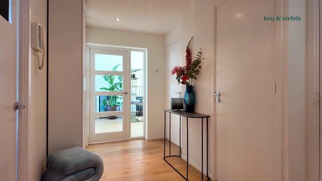 Modern open L-shaped kitchen, complete with built-in appliances, large oven, and gas stove. Opposite this is a wall unit equipped with a refrigerator. The spacious living room, with windows on both sides, overlooks the greenery of the park at the rear. The sliding windows in the living room have been recently modernized and replaced with HR++ glass as well as triple glazing.