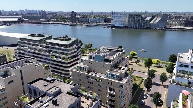 It is located on the leeward side of the building, where the wind has the least influence. You can sit outside in the shelter every season, even when the west wind is blowing hard. Even when it rains, you will stay dry, except when the east wind is blowing. Amsterdam city center lies at your feet to the south. The unobstructed view of the IJ river is never the same. You will not be bothered by neighbors across the IJ. Nowhere else in Amsterdam do people live further away than here. Yet the city center is only a 10-minute walk away. First through the park and then a 2-minute ride on the ferry, which runs 24/7.