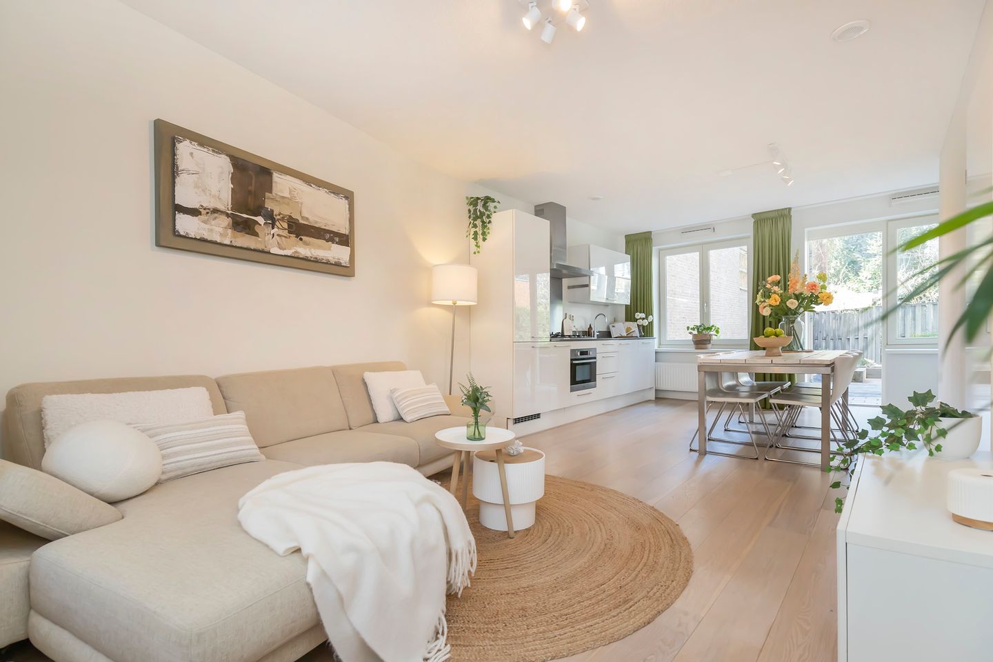 The living room is bathed in natural light thanks to its large windows at both the front and back. The modern kitchen is not only stylish but also practical, equipped with high-end appliances, including a dishwasher, 5-burner gas stove, combi oven, and a sleek extractor system. Step straight from the living area into the magnificent garden—a private oasis in the heart of the city!