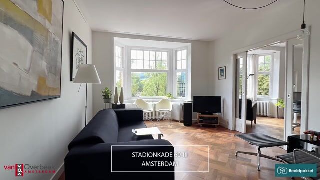 Entrance: spacious hallway with access to all rooms and staircase to the fourth floor. The generous and bright living room is a real eye-catcher thanks to the double bay windows, classic sliding doors, and beautiful views over the Zuider Amstel Canal.