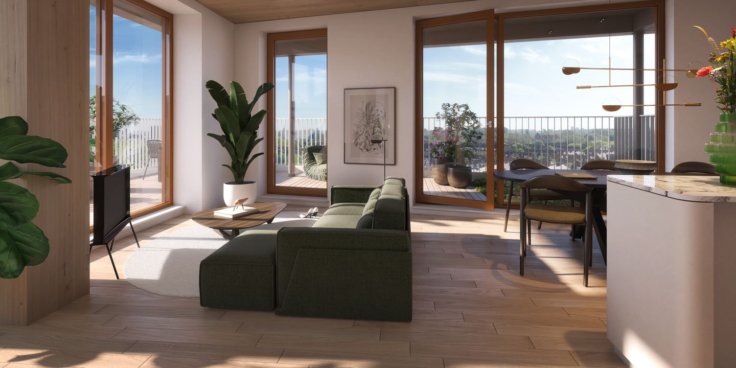Almost the entire structure of The Ark is made from sustainably sourced larch and spruce wood. This reduces the CO2 impact of building The Ark compared to traditional concrete construction. The visible wooden elements in the apartments create a warm, natural atmosphere.