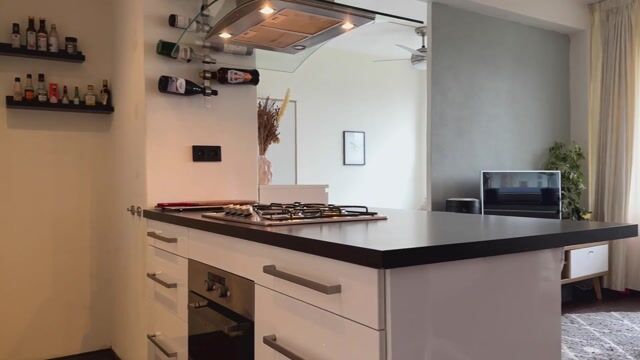 The hallway leads into the bright living room with large windows and a modern open kitchen with a kitchen island. The extended countertop of the island creates a comfortable dining area — perfect for everyday use or entertaining guests. Adjacent to the living room is the semi-open bedroom, separated by a partial wall. From here, you can access the modern bathroom, equipped with a walk-in shower, toilet, and washbasin. The washing machine connection is located in the bedroom, right next to the bathroom. The living room opens onto the sunny south-facing balcony of approximately 3 m². Thanks to the large windows and favourable orientation, the apartment enjoys abundant natural light throughout the day. A stylish dark-toned floor runs through the entire apartment (except the bathroom).
