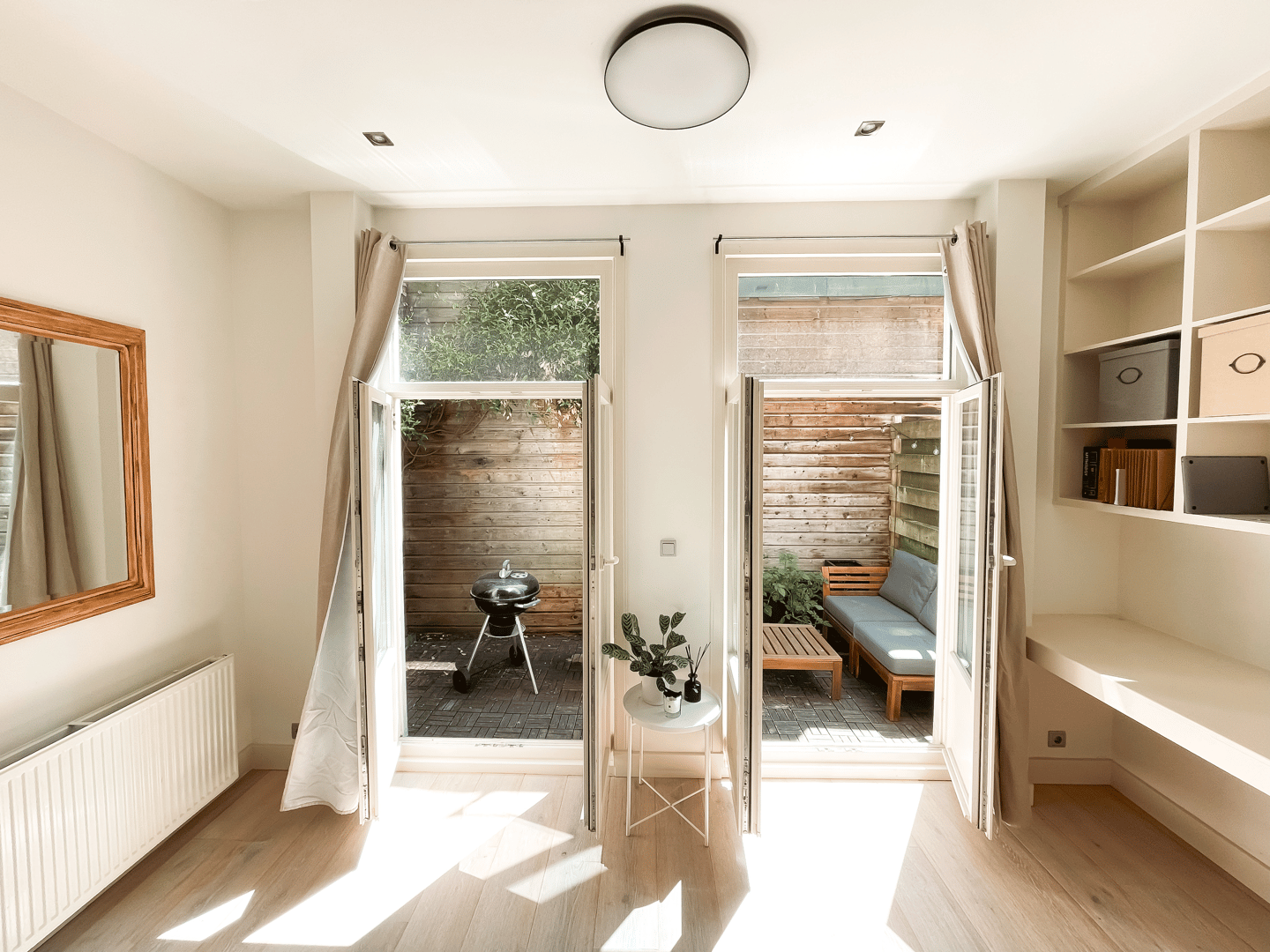 At the end of the hallway, via a via a small, cleverly hidden door, you reach the large bedroom with doors opening to the small but perfectly formed garden patio. The bedroom is currently laid out as a bedroom with an adjoining office/working space. However it could potentially be transformed into a second bedroom if and when required. The garden itself is 10m2 of private space and despite being in the vibrant de Pijp offers a slice of peace and quiet to enjoy the sun for most of the day as it’s south facing.