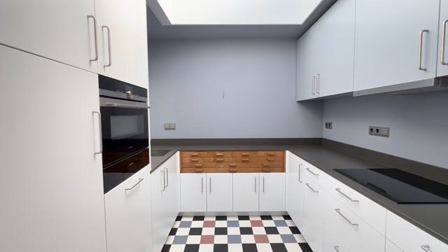 -In the middle of the living room is the semi open kitchen. This is surprisingly bright due to the large skylight.