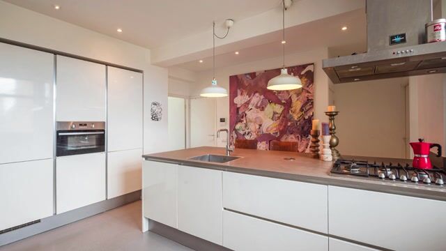 De keuken beschikt over een kookeiland, is modern, functioneel, en voorzien van inbouwapparatuur en veel bergruimte.