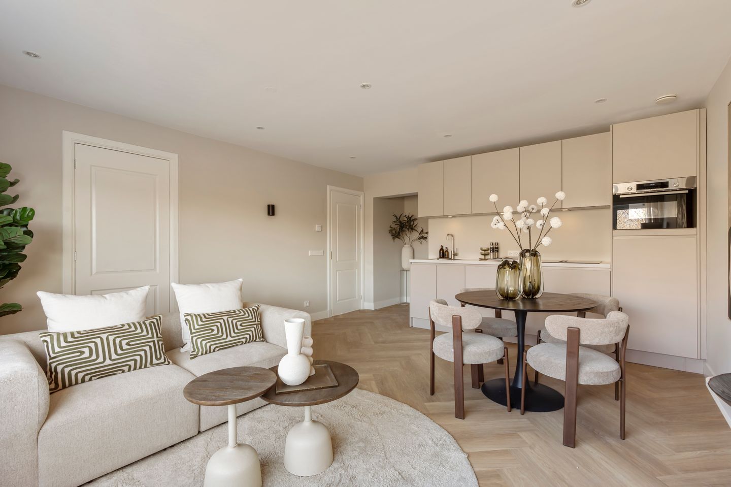 Through the entrance, you step into the hallway of the apartment. On the right-hand side, you will find the bright living room with an open kitchen. Thanks to the large front-facing windows, the living room benefits from plenty of natural light. The modern open kitchen is equipped with built-in Bosch appliances and features an induction cooktop.
