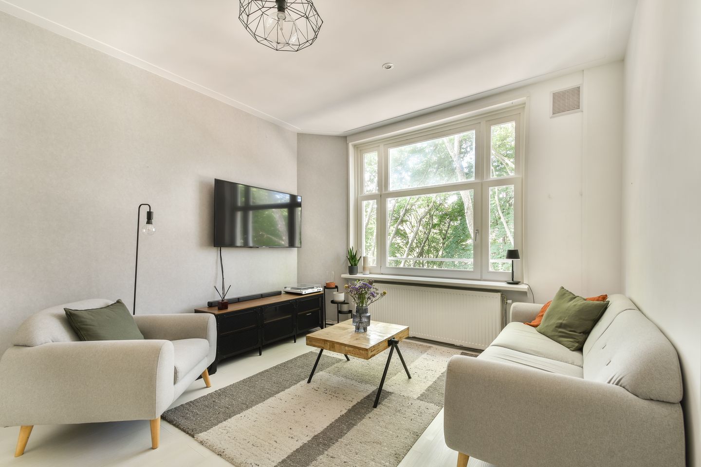 At the front of the home is the bright and welcoming living room, overlooking the tree-lined avenue. The evening sun floods this space with golden light. There’s plenty of room for a comfortable sitting area and dining setup. The open layout connects the spaces naturally.