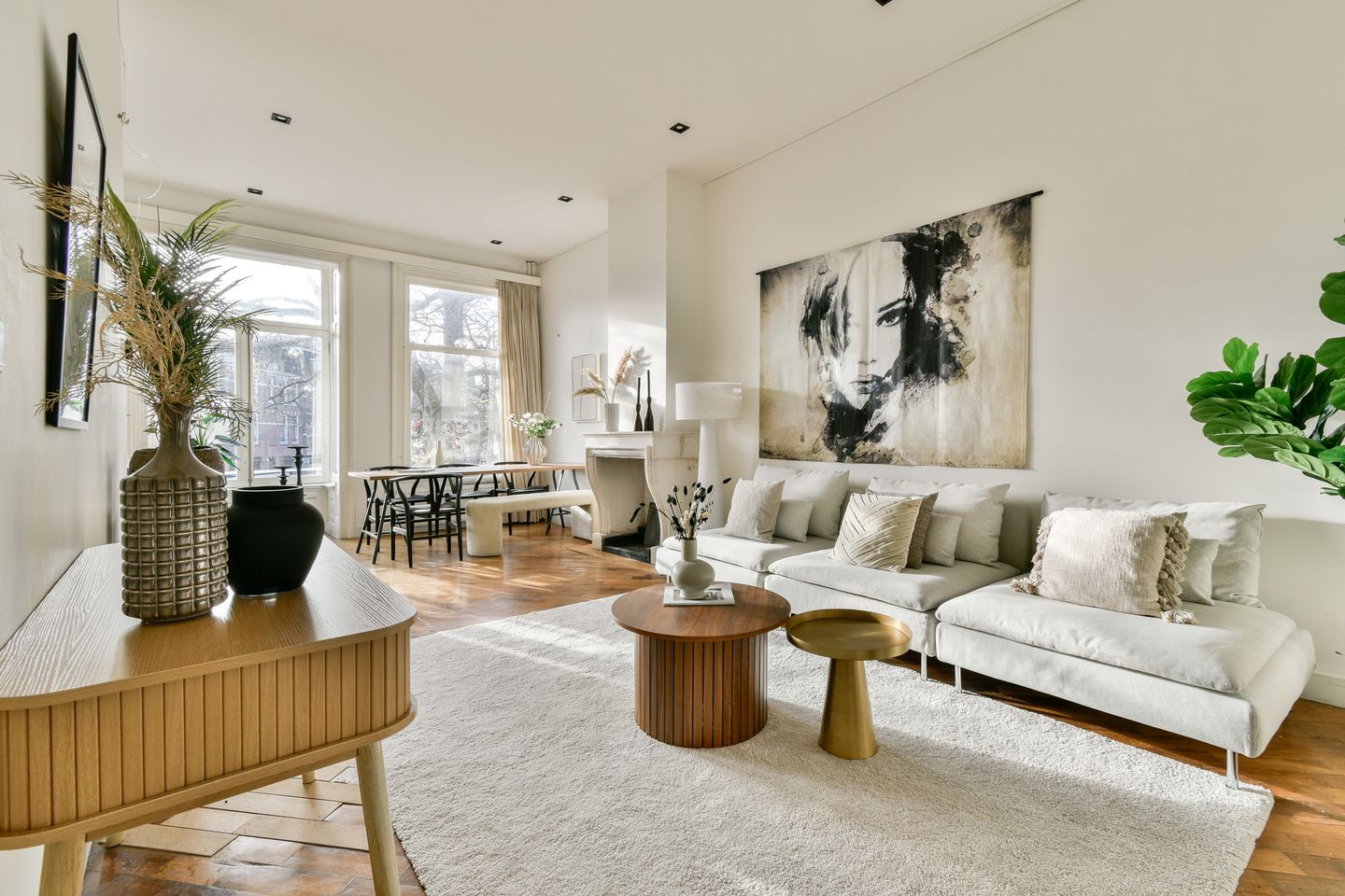 Upon entering, the elegant atmosphere is immediately noticeable: the over 3-meter-high ceilings, the original en-suite doors, the beautiful parquet flooring, and the warm glow of the (gas) fireplace give the living room a timeless touch of class. The bay window at the front offers beautiful light and a characteristic view.