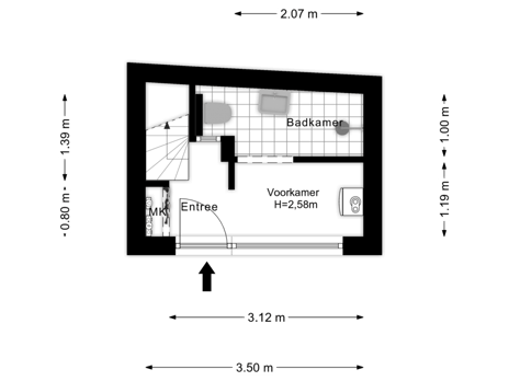 Here you’ll find the modern utility cupboard (new automatic electrical system), wardrobe area, office/study space with a cosy high table by the window, central heating cabinet with combi boiler, toilet with sliding door, and a shower with washbasin.