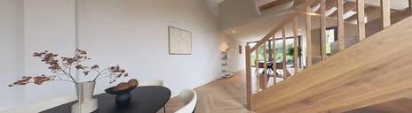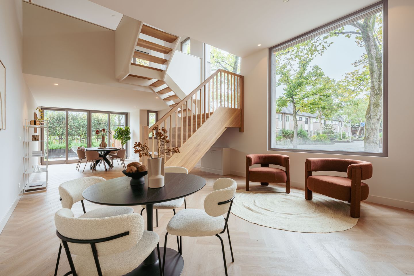 Through the entrance with a vestibule, you reach the separate toilet with a wash basin. The spacious living room spans the entire ground floor and features large sliding glass doors at the rear, allowing for abundant natural light and a spacious feel. Here you will find ample room for a comfortable sitting area, a kitchen that can be designed entirely to your own taste, and a large dining table. The sunny south-facing garden of approx. 27 m² includes a back entrance. The striking staircase centrally positioned in the house leads you to the upper floors.
