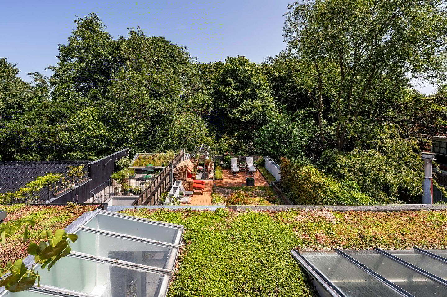 Via de keuken bereik je de fraaie daktuin van circa 75 m², deze grote daktuin is aangelegd met groendak, verschillende terrassen en sfeervolle tuinverlichting. Helemaal achterin staat een tuinkas met automatische beregening. Dankzij de diepte van de tuin geniet je hier de hele dag van de zon, in volledige privacy.