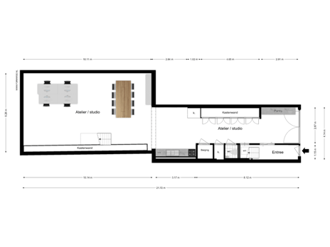 The ground floor is currently arranged as a studio, with an impressive ceiling height of 3.46 metres and a surface area of over 108 m². This space, complete with pantry, built-in cupboards, and an infinity wall, is ideally suited as a photo studio, atelier, or creative workspace, but could just as easily be transformed into a full-fledged living level with patio, office, or practice.