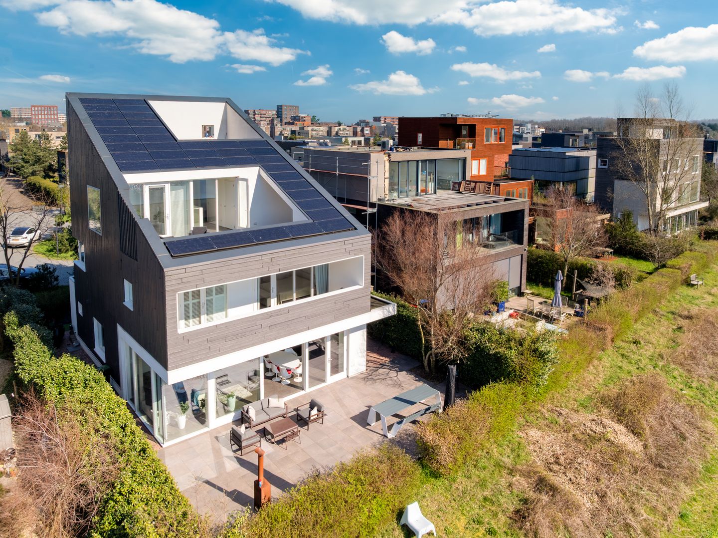The architect is Knevel Architecten. Great attention has been paid to natural light, sightlines, beautiful details, and the integration of solar panels on the sloped roof. The house offers ample storage space and sufficient room to install a sauna or outdoor kitchen on one of the terraces.