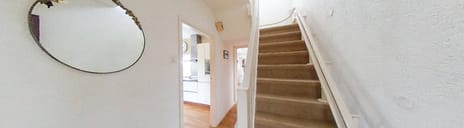 First floor: The staircase with landing and a rear-facing window leads to a spacious landing with a decorative diamond-shaped front window. Two front bedrooms overlook the garden. To the rear are a third bedroom and a large bathroom equipped with a washbasin with storage, lighted mirror, bathtub, generous shower, wall-mounted toilet and radiator.