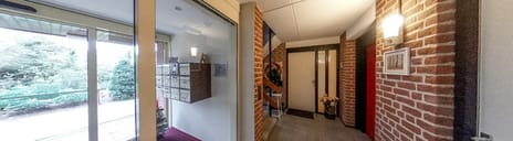 Afgesloten entree op de begane grond met videofooninstallatie en elektrische deuren.