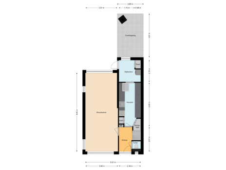 Aansluitend bevindt zich de bijkeuken, voorzien van een vaste kast, wasmachineaansluiting, losse koelkast en de omvormer van de zonnepanelen. Vanuit hier is er toegang tot de tuin.