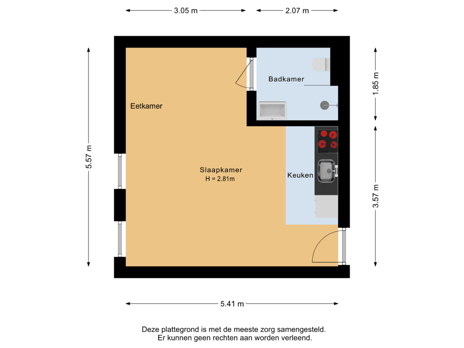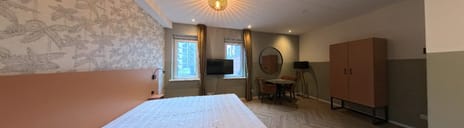 Via de trap bereik je de studio, gelegen aan de linkerzijde van de gang. De ruimte is efficiënt en smaakvol ingedeeld, zodat elke vierkante meter optimaal benut wordt. De studio zelf is compact maar heel doordacht ingedeeld: alles wat je nodig hebt bevindt zich in één open ruimte. De woon- en slaapruimte vormen samen een comfortabel geheel. Hier is plek voor: een tweepersoonsbed, een kledingkast, een eettafel én een tv-hoek met een lekkere bank en televisie. Dankzij de hoge ramen en de lichte kleurstelling voelt de ruimte open en uitnodigend aan — een prettige plek om te wonen en te ontspannen. Precies genoeg ruimte voor comfortabel wonen zonder verspilde meters.