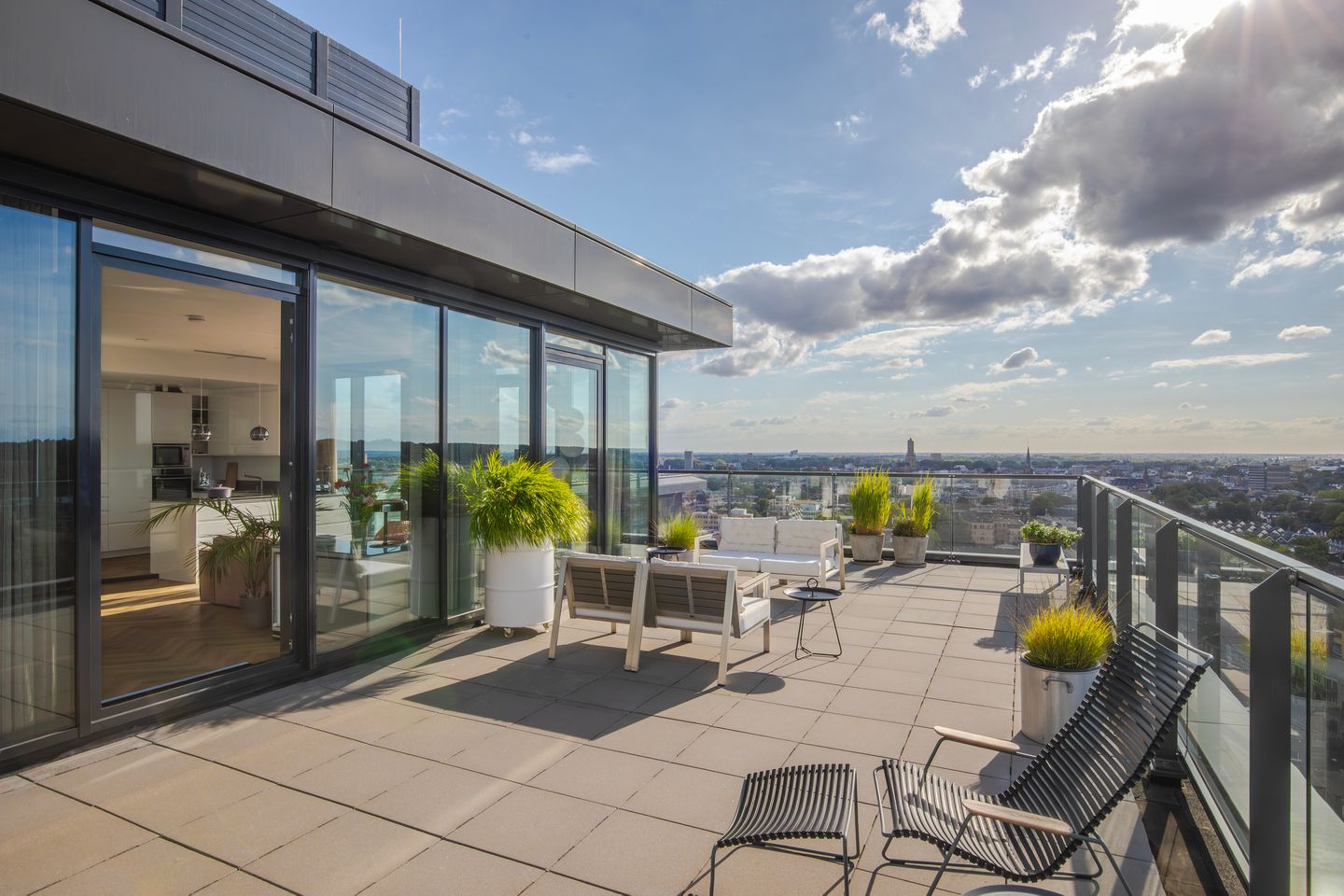 Vanuit de woonkamer stap je op het enorme dakterras met fenomenaal uitzicht.