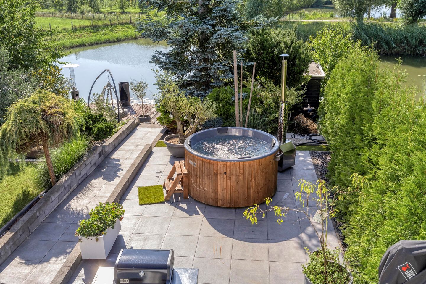 De rondom gelegen tuin biedt volop privacy en een fijne combinatie van zon en schaduw. Aan de waterzijde bevindt zich een eigen steiger – ideaal voor een kano, klein bootje of om in alle rust te genieten van de omgeving.