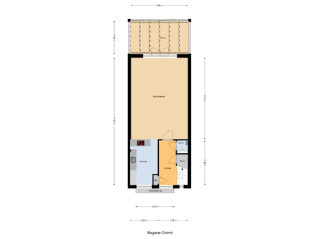 Upon entering you enter the hall, which has a wardrobe and provides access to the toilet, the meter cupboard, the stair cupboard and the living room with open kitchen.