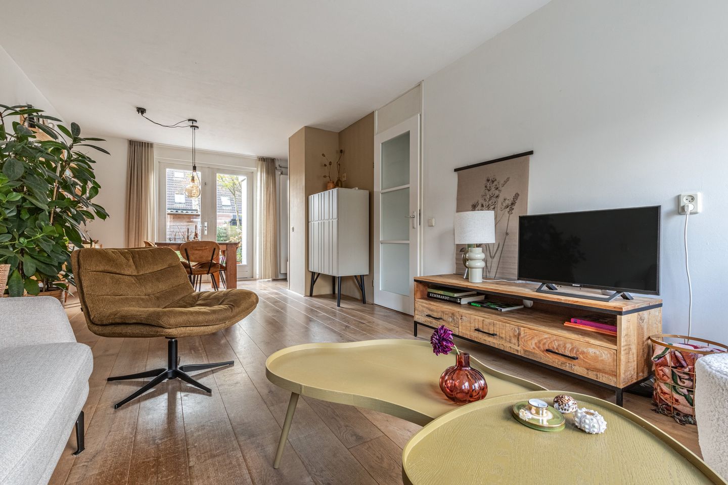 Via de voordeur kom je binnen in de ruime hal met garderobe, meterkast en een modern toilet met fonteintje. Vanuit de hal bereik je de sfeervolle L-vormige woonkamer, die dankzij de grote raampartijen geniet van veel natuurlijke lichtinval. De woonkamer biedt voldoende ruimte voor een royale zithoek aan de voorzijde en een gezellige eethoek richting de keuken. De tuin is bereikbaar middels de openslaande tuindeuren.