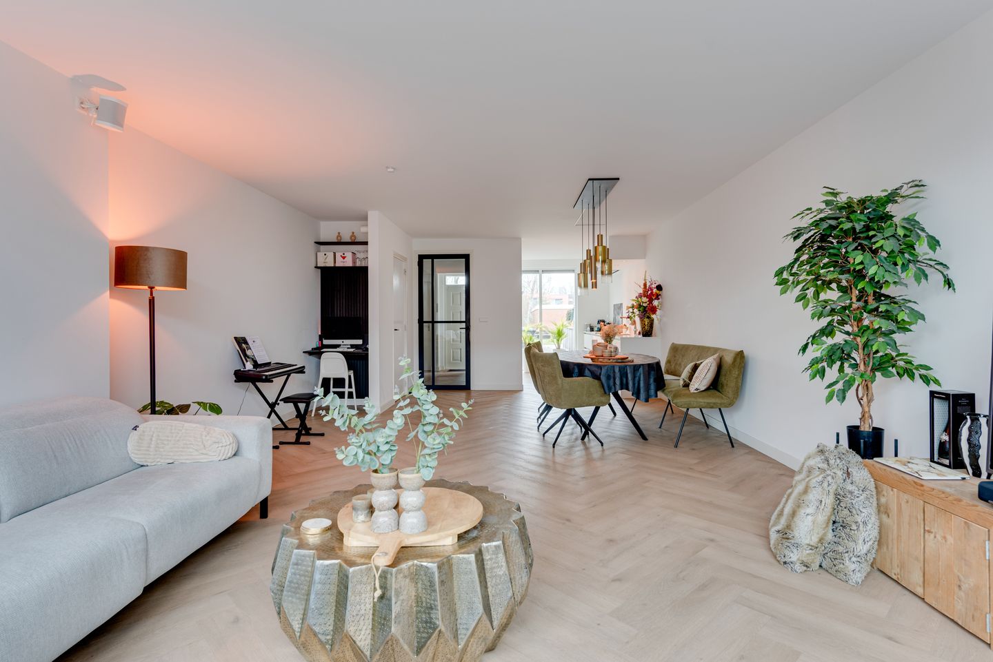 At the rear, the living room has been extended by no less than 3.5 meters, creating a generous and bright living space. The finish is sleek and contemporary. The floor features a herringbone PVC finish with underfloor heating — not only comfortable, but also stylish and luxurious.