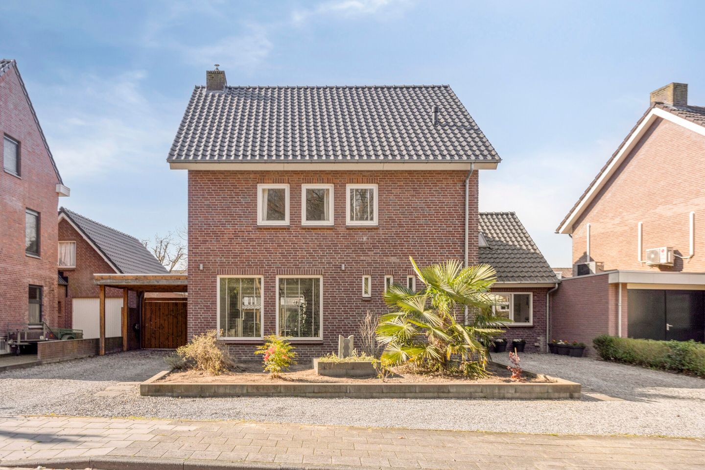 Oprit aan de linkerzijde met toegang de voordeur, een buitenkraantje en een deur naar de keuken. Aan de rechterzijde nog een oprit met hier carport 1, met mogelijkheid om een lader te plaatsen voor een elektrische auto. Aan de achterzijde zijn dubbele deuren met toegang tot carport 2 en de tuin.