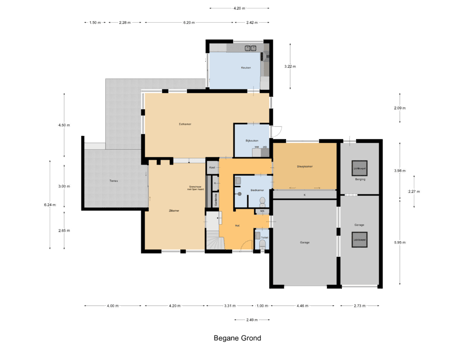 De inpandige garage van circa 26 m² is voorzien van een elektrische kantelpoort en elektra en is zeer geschikt voor een beroep of een bedrijf aan huis.
