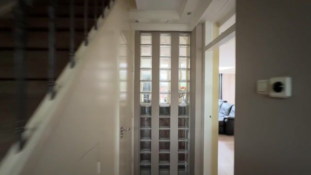 Enter the spacious hall with the meter cupboard, toilet with wall-hung toilet and sink finished with beige tiles, staircase to the first floor, and access to the living room.