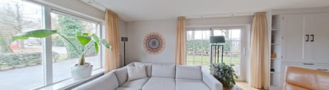Deze woonkamer is echt een plek waar u zich snel op uw gemak zult voelen. De verzorgde eikenhouten vloer en de nette afwerking geven een fijne uitstraling, en de houtkachel zorgt nog voor dat beetje extra sfeer die deze woonkamer zo fijn maakt! Het gehele leefgedeelte is voorzien van raampartijen, waardoor u leuk wegkijkt en er veel natuurlijk licht binnenkomt. U kunt hier een fijne zit plaatsen rondom de kachel, en om uw spullen mooi op te bergen is hier een inbouwkast geplaatst. Middels de schuifpui kunt u gemakkelijk de tuin bereiken.