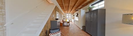 Als we verder lopen komen we in een royale ruimte waar u een leuke zit kunt creëren. De houtkachel maakt het binnen zitten nog eens extra aantrekkelijk. Vanuit hier krijgt u toegang tot twee slaapkamers en een opbergruimte, erg praktisch voor uw spullen. Door de vele ruimte is het mogelijk om in dit gedeelte bijvoorbeeld in te delen als een praktijk aan huis of als kantoor. Er zijn veel mogelijkheden, weet u al hoe u deze ruimtes gaat gebruiken?
