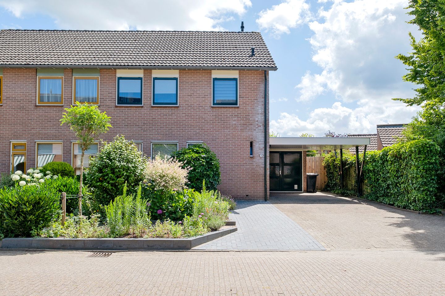 De aangebouwde garage (ca. 18 m²) beschikt over openslaande deuren aan de voorzijde en een loopdeur aan de achterzijde. Voor de garage bevindt zich een ruime carport. De oprit biedt parkeergelegenheid voor twee auto’s op eigen terrein.